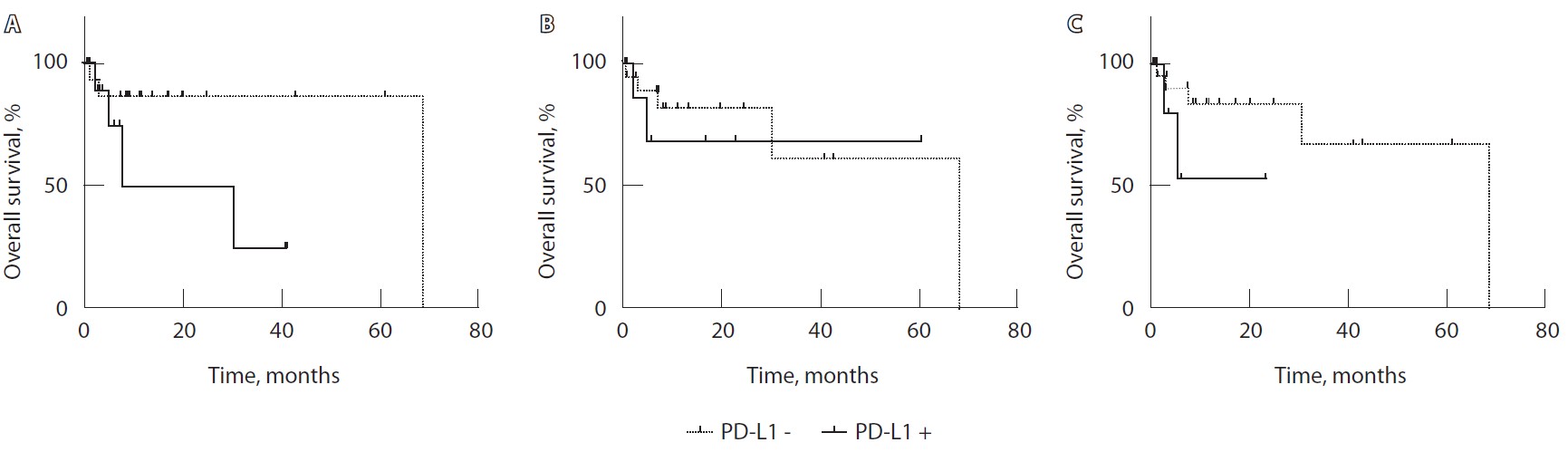 Fig. 2. Prognostic significance analysis of PD-L1 expression in various components of the dedifferentiated chondrosarcoma: overall survival of the patients depending on their PD-L1 expression in dedifferentiated (A), chondroid (B), and both (C) components of the tumor. PD-L1-, no PD-L1 expression; PD-L1+, PD-L1 expression present