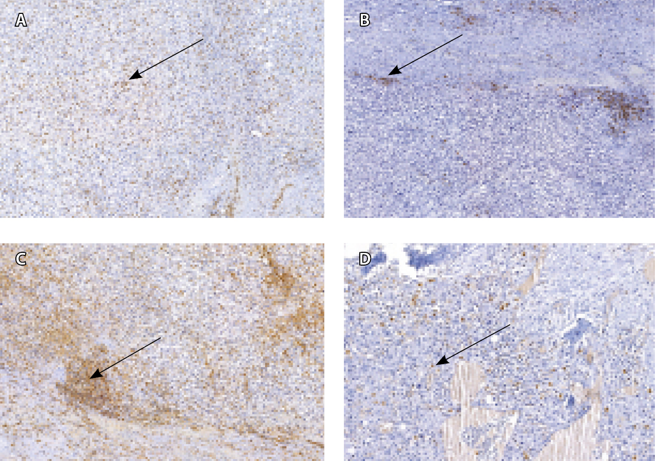Fig. 3. Immunohistochemical images. Expression of PU.1 (A), CD20 (B), CD4 (C), and CD8 (D) markers in the tumor-infiltrating lymphocytes in the samples of dedifferentiated chondrosarcoma (arrows). Micro specimen (×100)