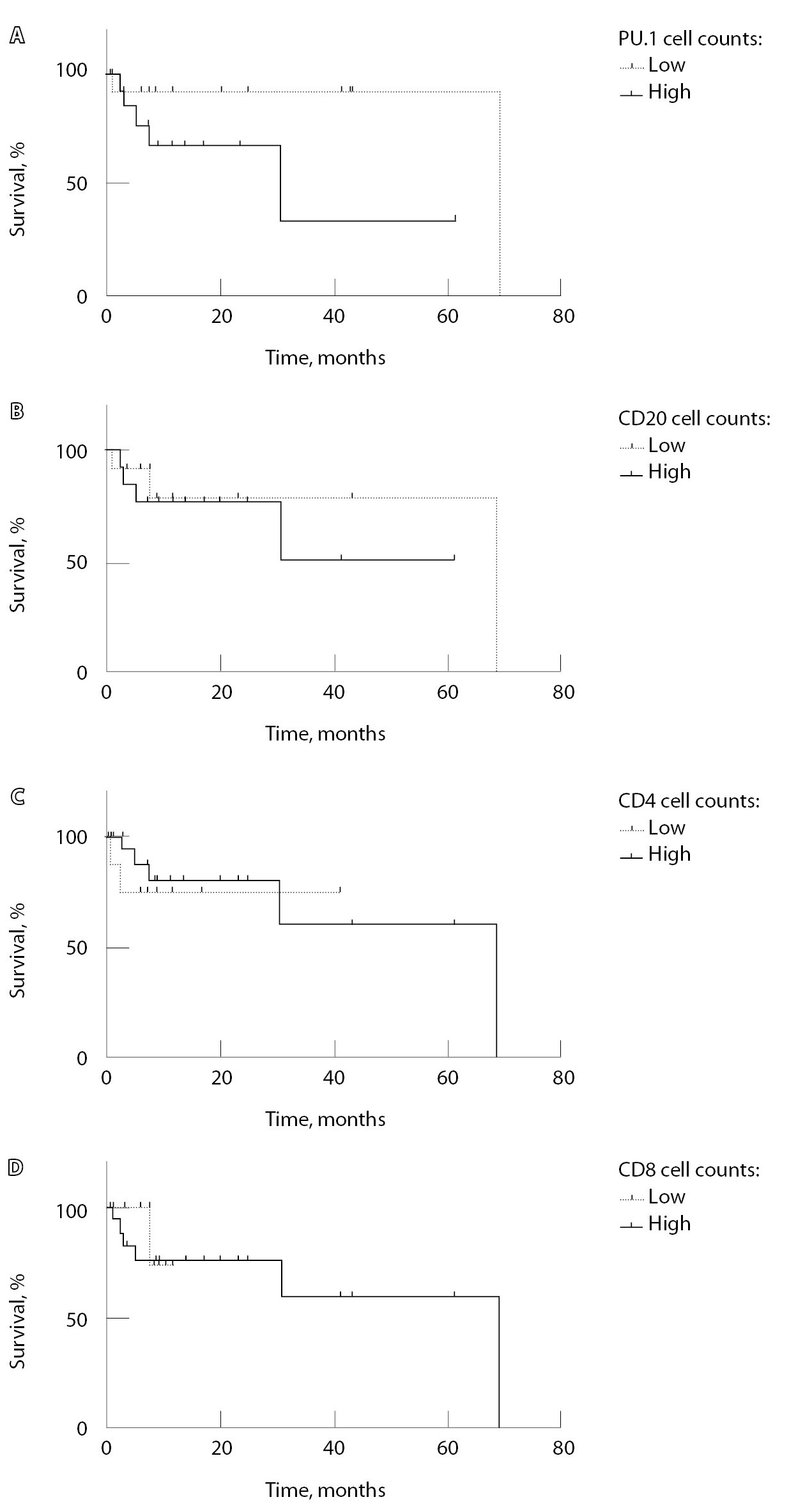 Fig. 4. Overall survival of patients with dedifferentiated chondrosarcoma depending on macrophage (A, PU.1+ cells), B lymphocyte (B, CD20+ cells), and T lymphocyte (C, CD4; D, CD8) counts in the stroma of dedifferentiated tumor components. The groups for comparison of survival were formed based on the counts of the microenvironmental immune cells above or below the average