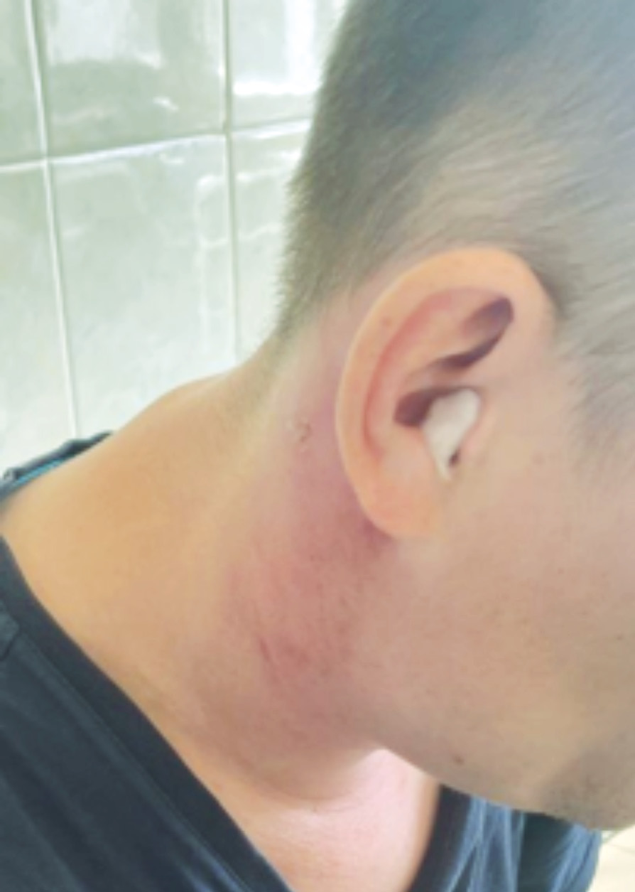 При осмотре обращало на себя внимание изменение конфигурации шеи за счет болезненного при пальпации инфильтрата в подчелюстной области и по правой переднебоковой поверхности шеи. Кожные покровы в проекции инфильтрата гиперемированы. Повороты головы сопровождались выраженной болезненностью. При осмотре лор-органов в правой заушной области выявлена припухлость, болезненная при пальпации, гиперемия, флюктуации не отмечалось (рис. 1). При отоскопии установлено: правый наружный слуховой проход широкий, содержал гнойное отделяемое, барабанная перепонка гиперемирована, инфильтрирована, имела перфорацию размерами до 2 мм в задненижнем квадранте, через перфорацию поступало гнойное отделяемое. Слух на правое ухо снижен (шепотная речь – 1 м, разговорная речь – 3,5 м). Проба Вебера латерализовалась вправо. По другим лор-органам – без патологии.