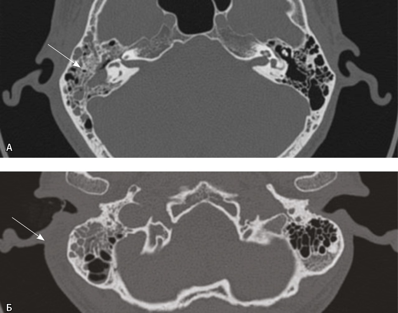 Рис. 2. Компьютерная томография височной кости, аксиальный скан, костное окно. А – в клетках сосцевидного отростка, антруме и барабанной полости справа определяется содержимое (стрелка); Б – асимметричное утолщение парааурикулярных мягких тканей справа (стрелка)
