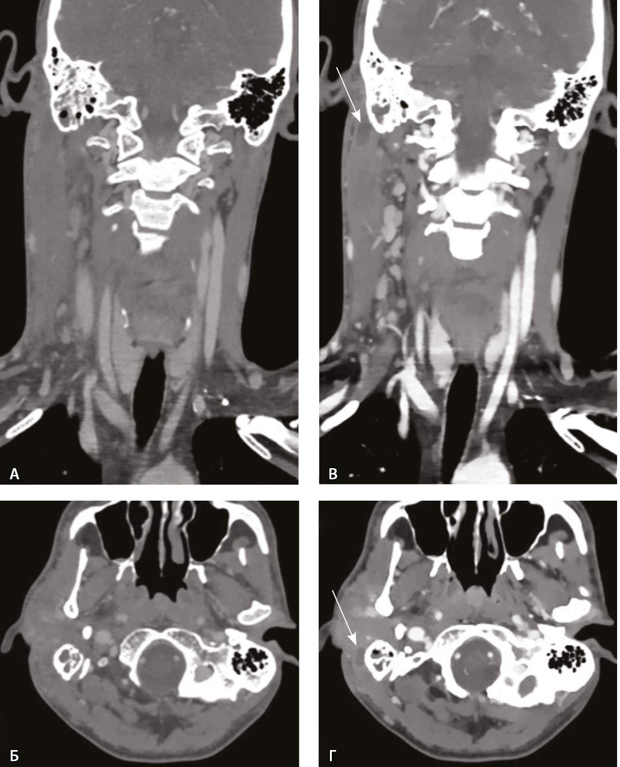 Рис. 3. Компьютерная томография шеи, венозная фаза. Фронтальная реконструкция и аксиальный скан. А, Б – обычный режим, мягкотканное окно; В, Г – моноэнергетическое изображение 40 кеВ на том же уровне: виден субпериостальный абсцесс вдоль латеральной поверхности верхушки сосцевидного отростка (стрелки), не определяемый в обычном режиме