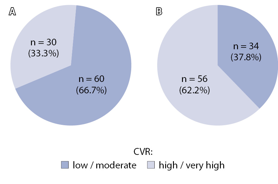 Важно отметить, что оценка ССР у онкологических больных отличается от предусмотренной рекомендациями по кардиоваскулярной профилактике для общей популяции, поскольку учитывает дополнительные факторы, связанные с ПОЛ, такие как исходный риск кардиоваскулотоксичности, ее проявления в процессе терапии и применение противоопухолевых средств с высоким риском долгосрочных сердечно-сосудистых осложнений (прежде всего антрациклинов и лучевой терапии) [6]. Результаты нашего исследования ярко иллюстрируют эти различия: доля пациенток с высоким / очень высоким ССР, определенным в соответствии с рекомендациями по кардиоонкологии, составила 62,2% и двукратно превысила данный показатель, рассчитанный по традиционным калькуляторам ССР. Принимая во внимание недостаточную информированность врачей о способах стратификации риска у больных РМЖ, можно предположить, что в реальной клинической практике ССР у данной категории больных недооценен.