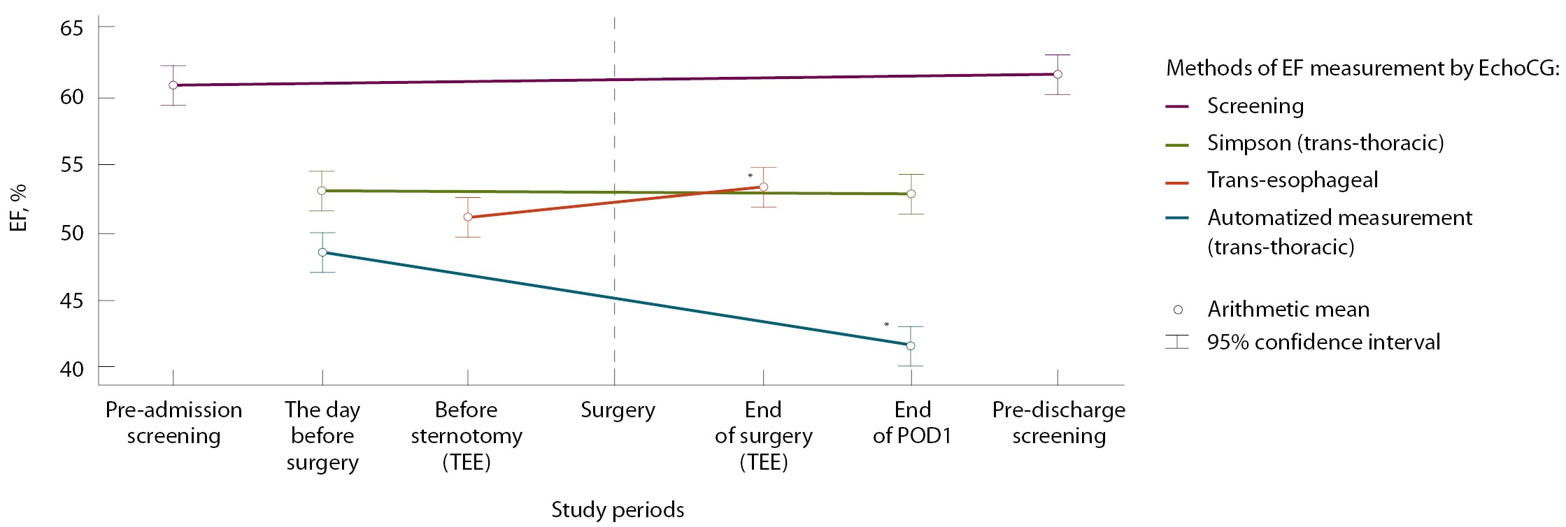 После получения добровольного информированного согласия, накануне операции пациентам выполняли ЭхоКГ с оценкой ФВ левого желудочка по методу Симпсона (ФВсимпсон), а также исследование GLS, КСО и КДО левого желудочка с автоматическим измерением ФВ (ФВавто) с помощью программы QLAB 10.0 на аппарате Philips CX-50 (Philips, Нидерланды). Чреспищеводное эхокардиографическое исследование проводили после индукции в анестезию перед началом вмешательства и при его завершении (с оценкой ФВсимпсон) параллельно с измерением сердечного индекса (СИ) и индекса УО (ИУО) с помощью препульмональной термодилюции (монитор Nihon Kohden, Япония). В конце первых послеоперационных суток при восстановлении сознания и спонтанного дыхания повторяли измерения ФВсимпсон, ФВавто, СИ, ИУО, GLS с расчетом КСО/КДОавто. Перед выпиской из хирургического отделения проводили скрининговое исследование с оценкой ФВ, которую сравнивали со скрининговым показателем ФВ, определенной амбулаторно до поступления в стационар.