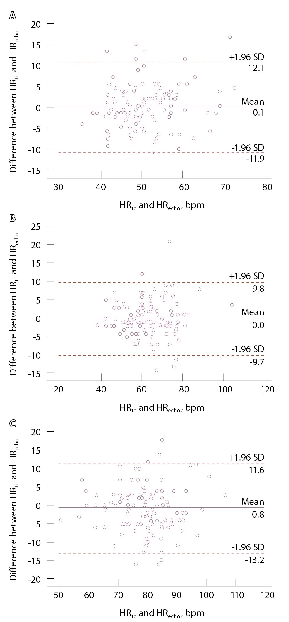 При оценке частоты сердечных сокращений (ЧСС) в начале операции во время проведения термодилюции и эхокардиографических измерений пределы согласованности были -11,6 (95% ДИ -13,5; -9,7) и 11,4 (95% ДИ 9,5; 13,3) при смещении -0,1 и ошибке 27,4%. В конце операции пределы согласованности определения ЧСС находились на уровне -9,1 (95% ДИ -10,6; -7,6) и 8,8 (95% ДИ 7,3; 10,3) при смещении -0,2 и ошибке 13,9%. В конце первых послеоперационных суток пределы согласованности достигли -12,9 (95% ДИ -14,9; -10,9) и 10,9 (95% ДИ 9,0; 12,9) при смещении -1,0 и ошибке 16,3% (рис. 3). Корреляции для значений ЧСС перед стернотомией в конце операции и в конце первых послеоперационных суток составили rho = 0,669 (p < 0,0001), rho = 0,892 (p < 0,0001) и rho = 0,750 (p < 0,0001) соответственно.