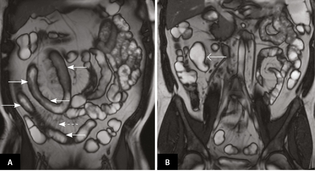 Рис. 1. Магнитно-резонансная энтерография (01.10.2019), Т1-взвешенное изображение после внутривенного контрастного усиления (гадобутрол, 5 мл), фронтальная проекция: A – асимметричное утолщение стенки в дистальных петлях подвздошной кишки и терминальном отделе подвздошной кишки (сплошные стрелки), незначительно выраженная сосудистая реакция брыжейки (пунктирная стрелка); Б – престенотическое расширение подвздошной кишки перед местом поражения (открытая стрелка)