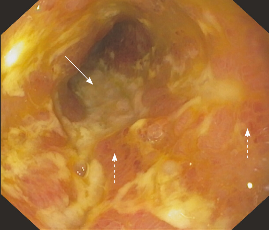 Рис. 2. Энтероскопия от 08.04.2022: множественные сливающиеся эрозии и язвы под фибрином (сплошная стрелка), участки гиперемии слизистой оболочки в терминальном отделе подвздошной кишки (пунктирные стрелки)