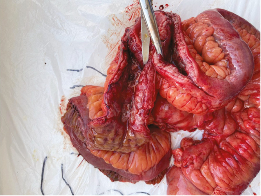 Рис. 3. Фото операционного материала. Препарат тонкой кишки со стриктурами и феноменом «ползучий жир»