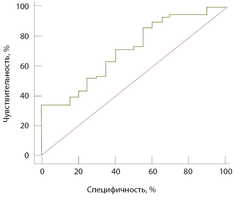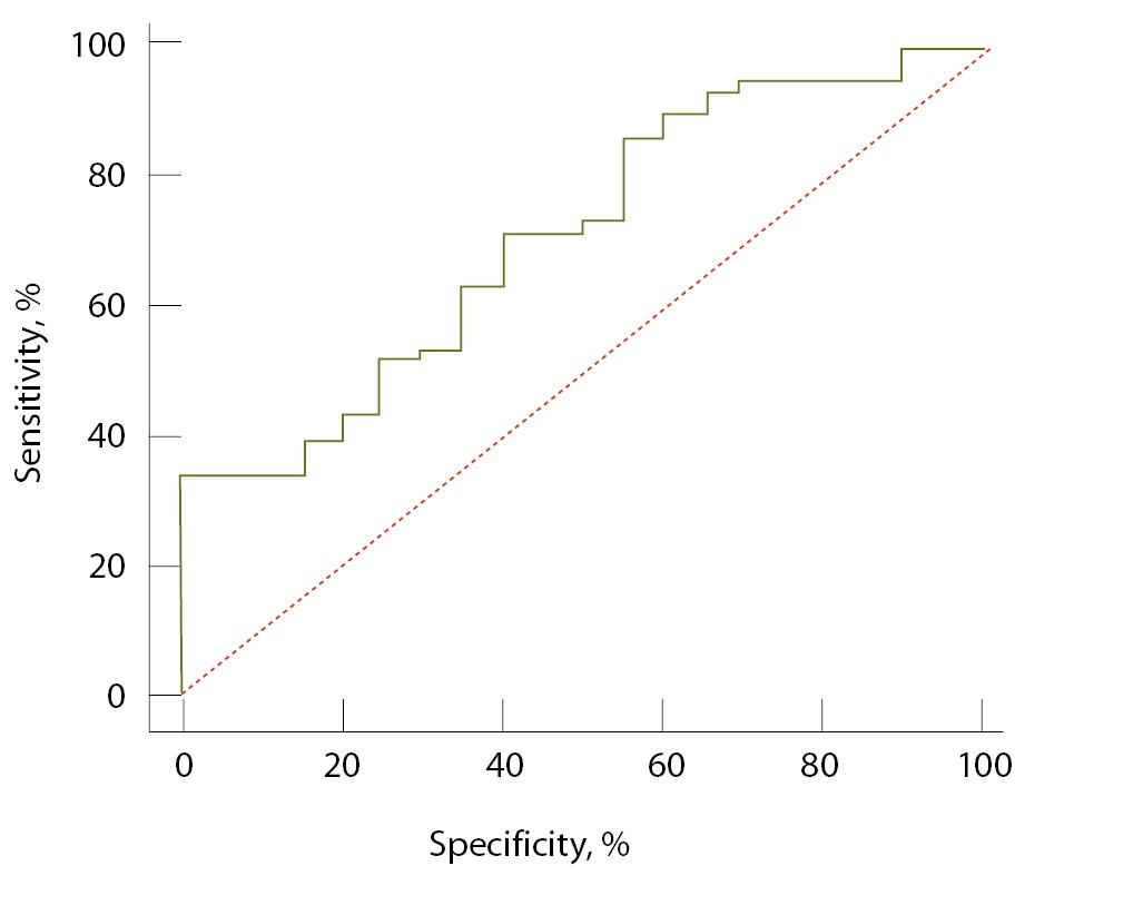 По результатам ROC-анализа, проведенного для группы ЗЭОЯ, диагностическая значимость растворимой формы галектина-3 оценивается как умеренная: AUC составила 0,702 при 95% доверительном интервале (ДИ) 0,585–0,818, p = 0,004 (рис. 1). При пороговом значении концентрации галектина-3, равной 8,84 нг/мл, чувствительность теста была 62,93%, а специфичность – 65%. При использовании медианного значения в качестве порогового уровня маркера чувствительность снижается до 50%, при этом специфичность повышается до 75%.