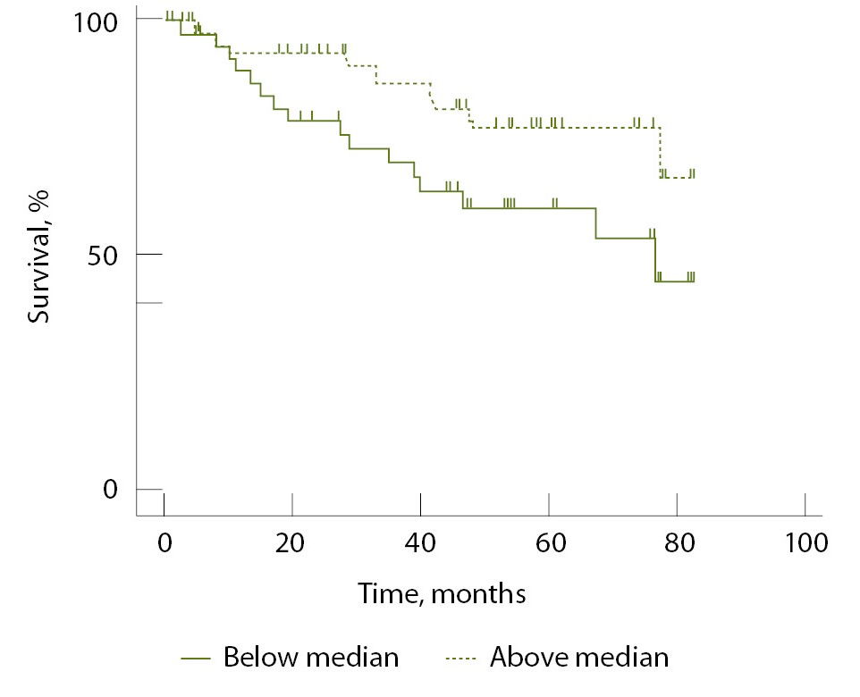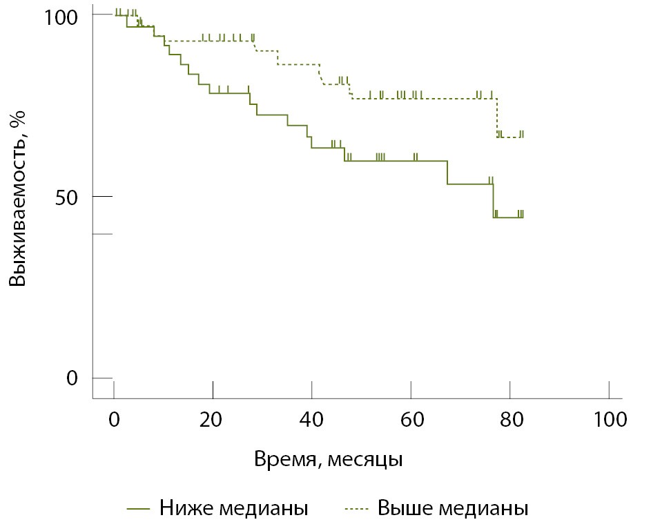 Статистический анализ проведен с использованием программы GraphPad Prizm 10.0. Анализ ассоциации клинико-морфологических характеристик (стадия заболевания, размер опухоли, наличие регионарных и отдаленных метастазов) и уровня содержания галектина-3 проводили с помощью непараметрических критериев Манна – Уитни и Краскела – Уоллиса. Анализ информативности диагностического метода (оценка его чувствительности и специфичности) выполняли с помощью построения ROC-кривых (англ. receiver operating characteristic – рабочая характеристика приемника) и вычисления площади под ними (англ. area under the curve, AUC). Для анализа общей выживаемости больных разделили на 2 группы сравнения в зависимости от медианы содержания галектина-3 в сыворотке крови. Анализ общей выживаемости проводили путем построения кривых дожития по методу Каплана – Мейера. Период наблюдения составил временной интервал с момента операции до смерти пациента или его последнего посещения врача. Сравнение статистической значимости различий осуществляли при использовании логарифмического рангового критерия. Для оценки потенциального влияния различных факторов риска на выживаемость дополнительно выполняли многофакторный анализ с использованием непараметрической модели пропорциональных рисков Кокса. Различия и корреляции считали статистически значимыми при p < 0,05.