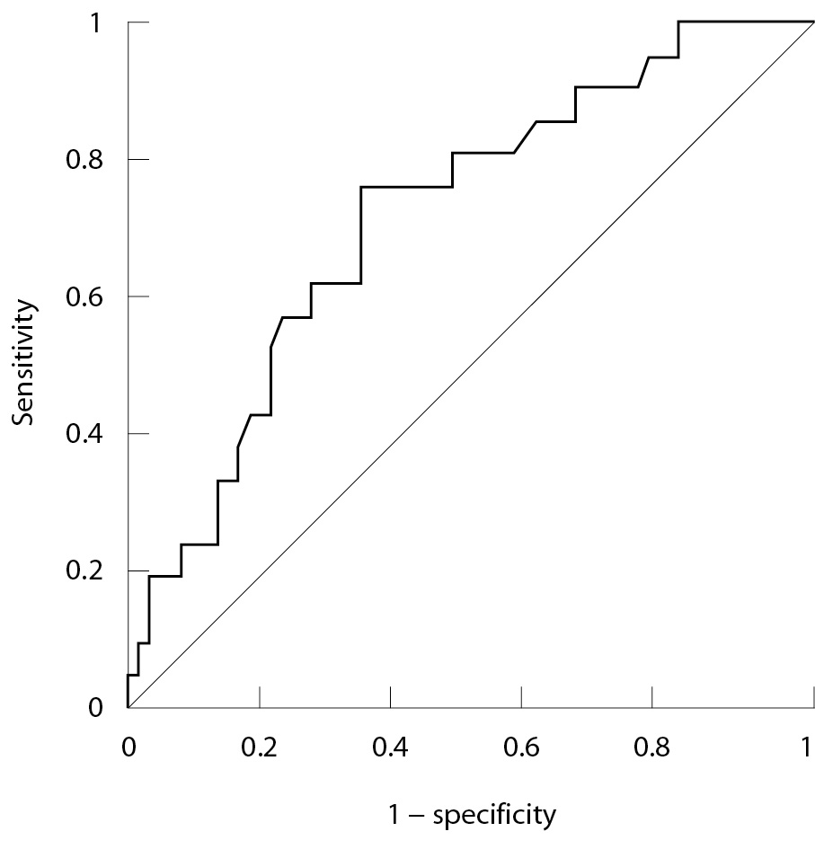 Для определения оптимального порогового значения функции вероятности P выполнен ROC-анализ (рис. 2). Пороговое значение выбрано по принципу равенства чувствительности и специфичности. При значении функции вероятности P = 0,228 модель имеет чувствительность 76% и специфичность 66% (AUC (англ. area under the curve, площадь под кривой) = 0,716; p < 0,001).