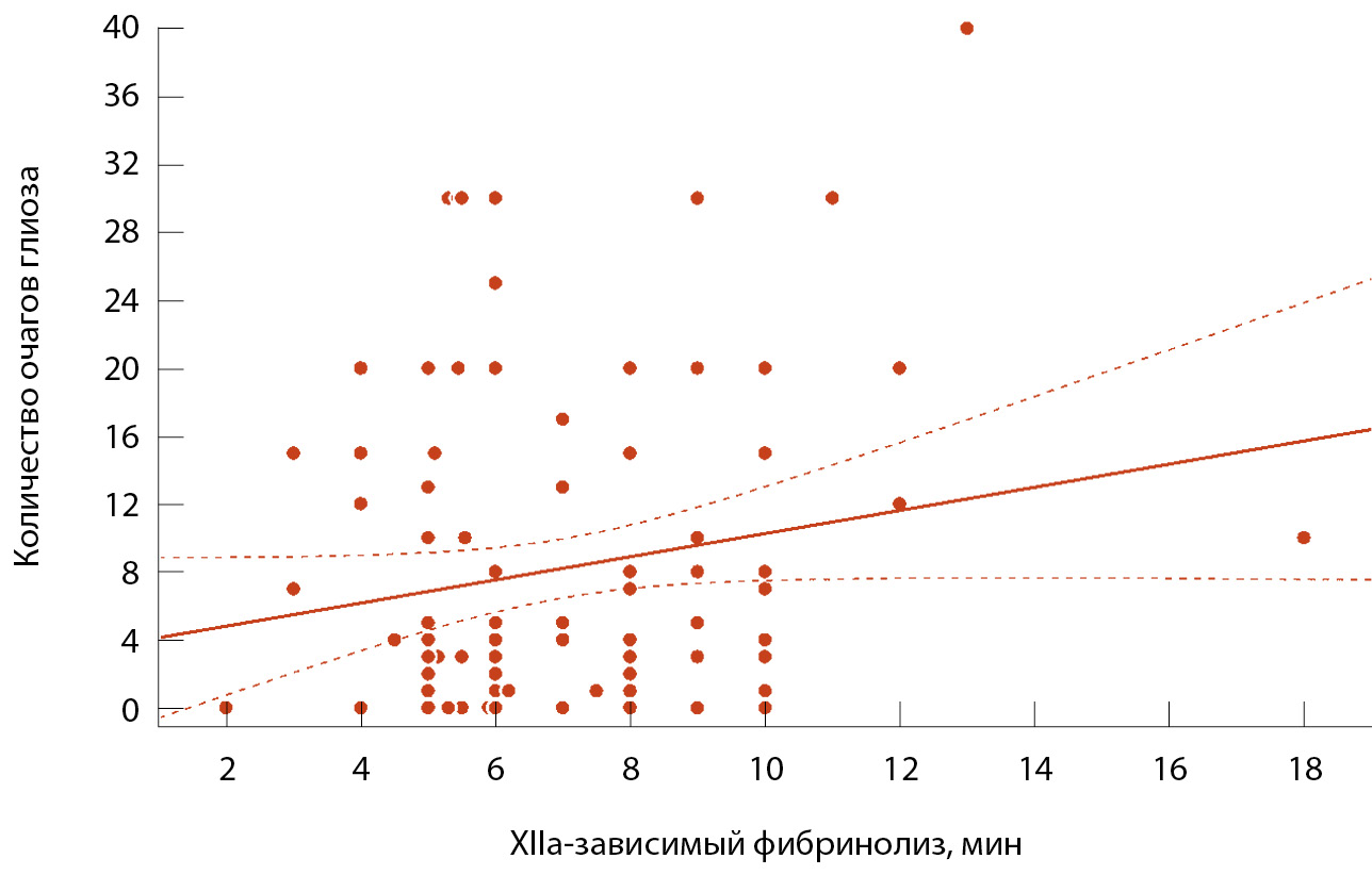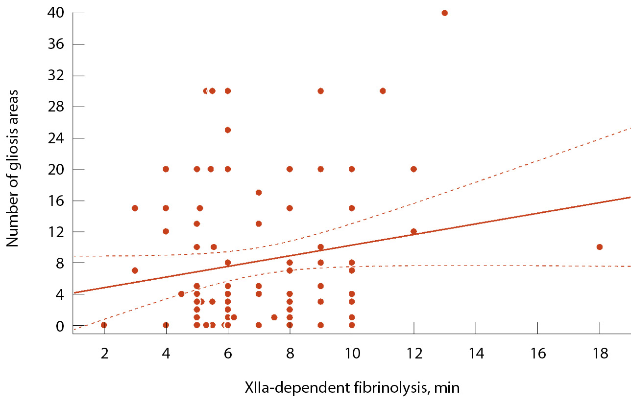 Рис. 3. Регрессионная связь XIIa-зависимого фибринолиза с количеством очагов глиоза (модель 1)