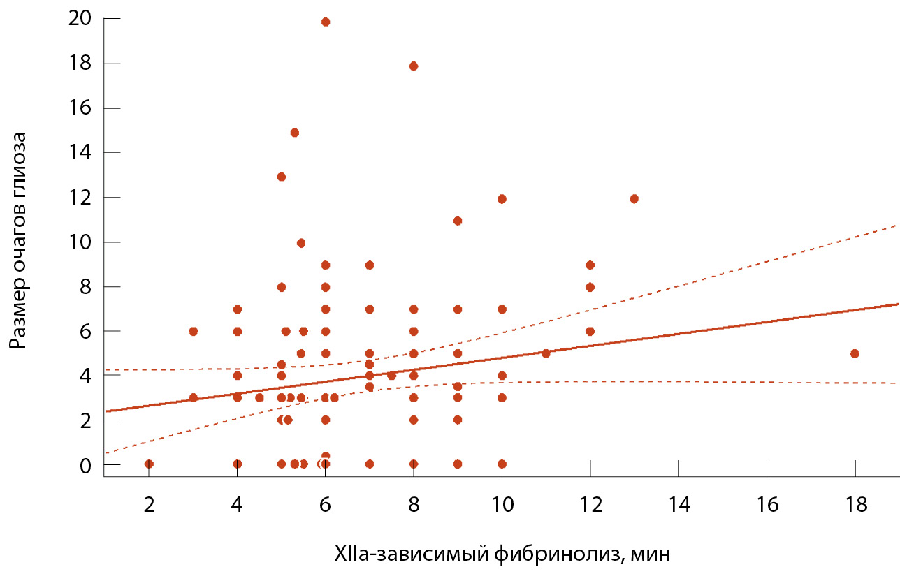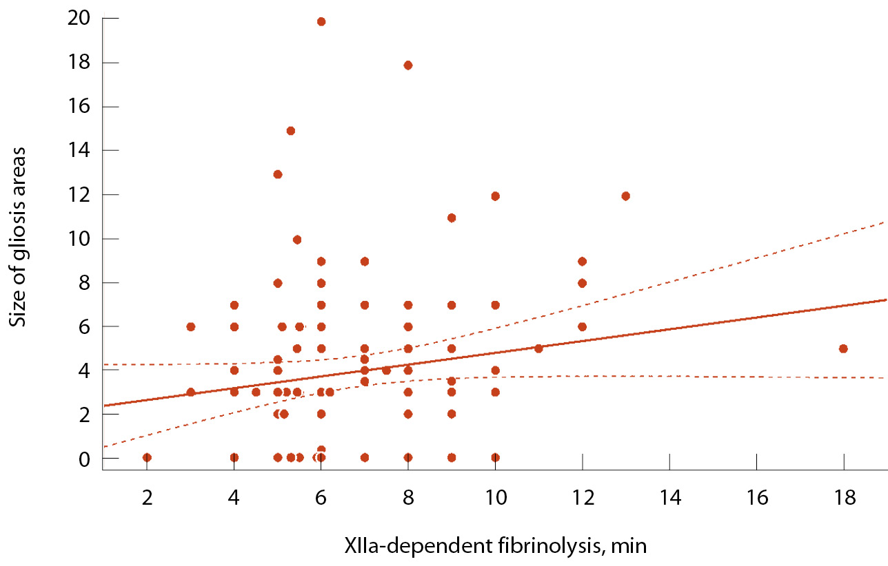 Рис. 4. Регрессионная связь XIIa-зависимого фибринолиза с размером очагов глиоза (модель 2)