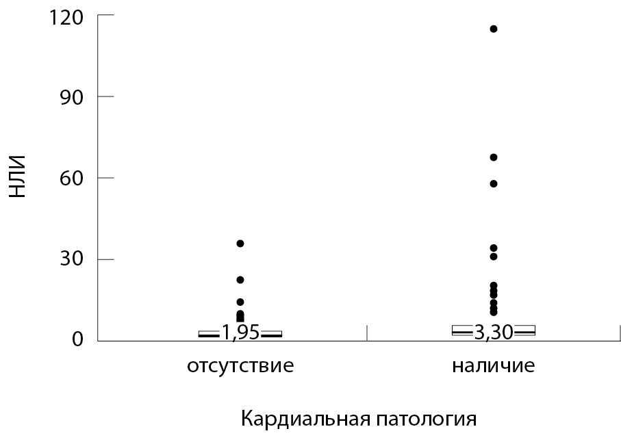 В целом НЛИ у госпитализированных больных COVID-19 с кардиальной патологией (вне зависимости от нозологии) был статистически значимо выше, чем аналогичный показатель у таких же пациентов, но без ранее диагностированных сердечно-сосудистых заболеваний (рисунок).