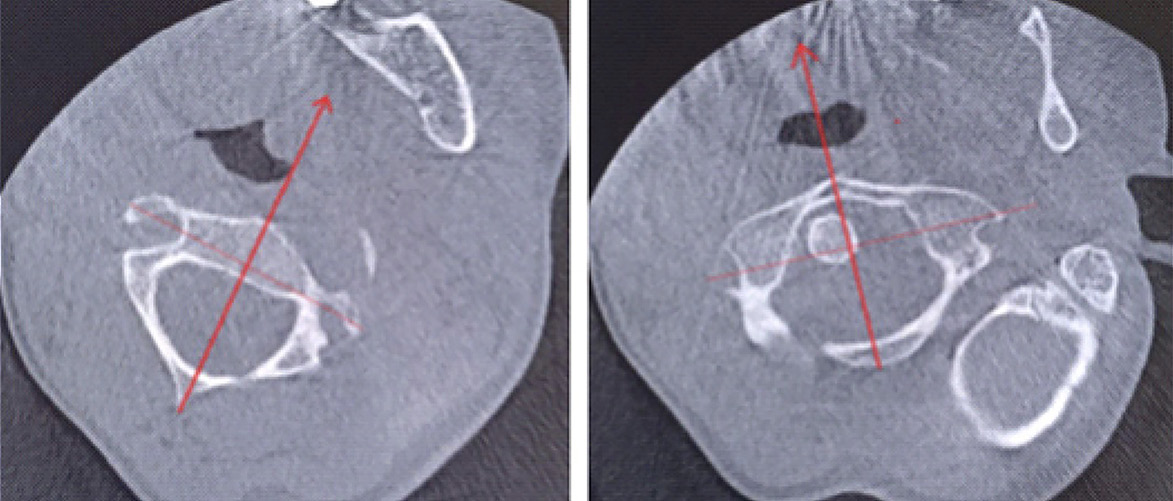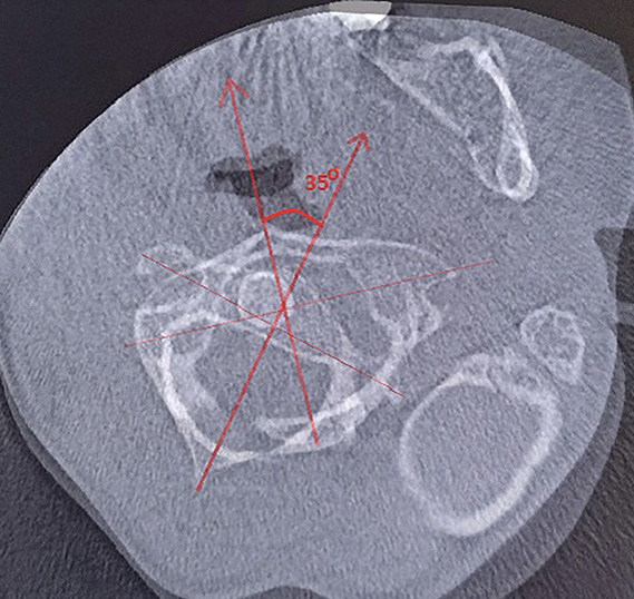 Для уточнения характера выявленных изменений в ручном режиме с помощью программы Adobe Photoshop© выполнено наложение аксиальных срезов 1-го и 2-го шейных позвонков, полученных по отдельности, с созданием единого изображения с возможностью комплексной оценки взаимоотношений изучаемых сегментов (рис. 2). При анализе смоделированного изображения обнаружено, что ротация атланта составляет 35° вправо (рис. 3). Суставные поверхности латерального атлантоаксиального сустава справа совпадают, а слева –суставная поверхность атланта смещена кпереди, что соответствует ротационному подвывиху типа II по классификации J. W. Fielding и R. J. Hawkins [8].
