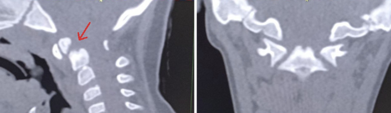 Рис. 5. Компьютерная томография шейного отдела позвоночника, сагиттальный срез (А), фронтальный срез на уровне зубовидного отростка С2 позвонка (Б). Стрелкой обозначено место перелома зубовидного отростка С2 позвонка