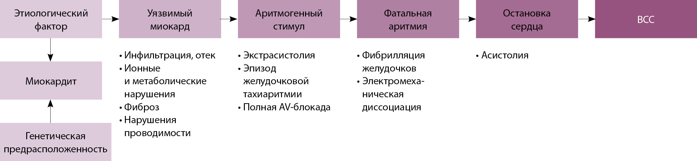 Наиболее частая причина летального исхода при миокардите – нарушение ритма сердца. Полиэтиологический характер миокардита, фоновые состояния и электрофизиологические свойства миокарда определяют различные патофизиологические особенности фатальной аритмии. Обычно это фибрилляция желудочков или, реже, выраженная брадикардия [33]. Воздействие триггерных и модулирующих факторов на поврежденный миокард запускает цепь событий, ведущих к остановке сердца и в итоге – к ВСС (рис. 1).