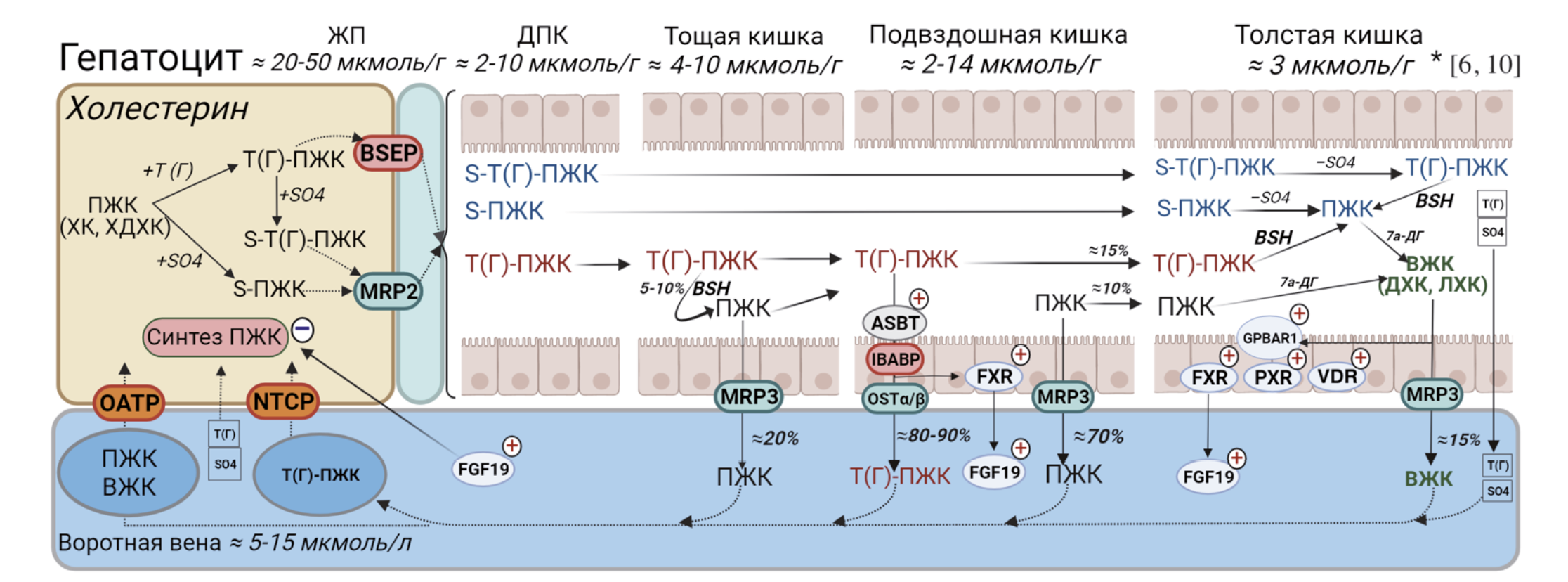 В гепатоцитах ХК и ХДХК амидируются глицином или таурином с образованием конъюгированных солей ЖК. Сульфатирование первичных ЖК происходит в 3-OH-положении посредством сульфотрансферазы (SULT2A1) с образованием сульфатов конъюгированных и неамидированных ЖК. Реакции конъюгирования и сульфатирования способствуют детоксикации ЖК, увеличивают их растворимость, минимизируют пассивную абсорбцию в кишечнике и повышают устойчивость к расщеплению ферментами поджелудочной железы. После синтеза в гепатоцитах конъюгированные и сульфатированные ЖК выводятся в желчные капилляры при помощи экспортирующей помпы ЖК (англ. bile salt export pump, BSEP) и белка 2-го типа, связанного с множественной лекарственной устойчивостью, (англ. multiple drug resistance protein 2, MRP2) соответственно [9]. Билиарные ЖК накапливаются в желчном пузыре и секретируются в двенадцатиперстную кишку после приема пищи. В просвете тонкой кишки ЖК образуют смешанные мицеллы с пищевыми жирами, моноацилглицеринами и жирными кислотами, которые увеличивают площадь поверхности липидов, способствуя перевариванию панкреатическими липазами и абсорбции на мембране щеточной каймы тонкого кишечника [10].