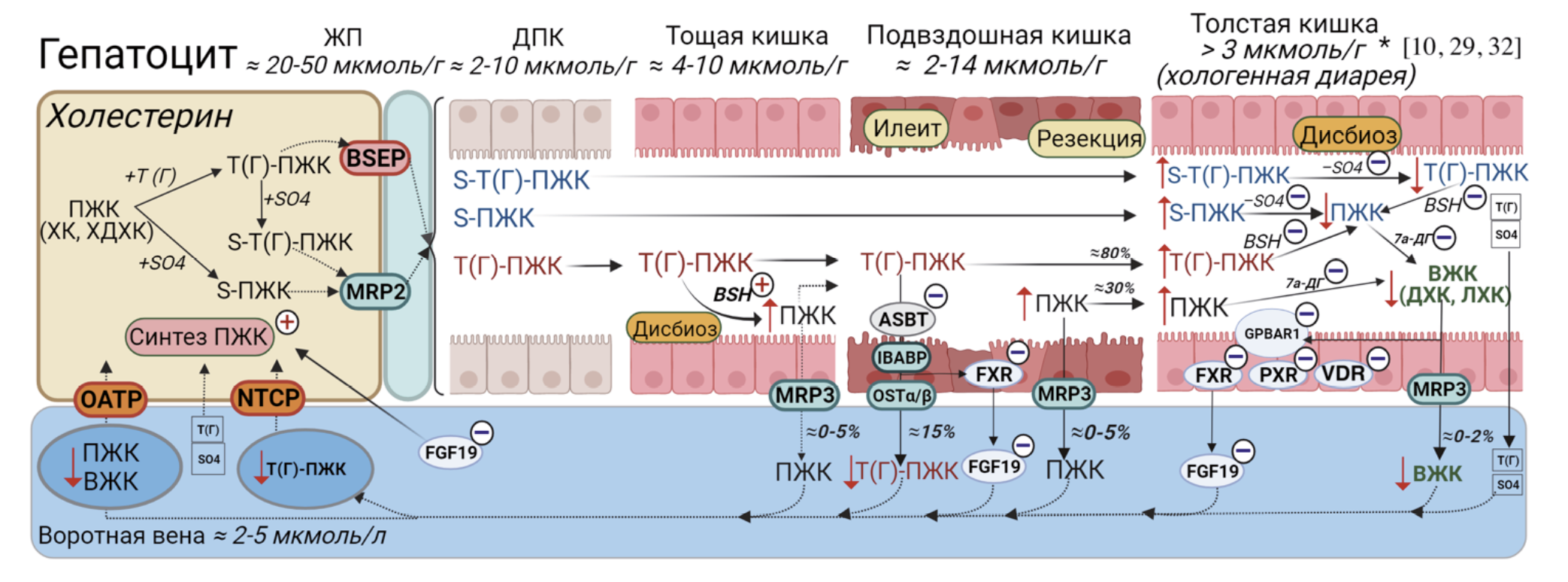 Примечание: Синтез первичных желчных кислот (ПЖК) – холевой (ХК) и хенодезоксихолевой (ХДХК) – происходит в гепатоцитах с образованием тауро (глико)-конъюгатов (Т(Г)-ПЖК) и сульфатированных ПЖК (S-ПЖК, S-Т(Г)-ПЖК). Затем ПЖК выводятся в желчные капилляры при помощи помпы, экспортирующей ЖК (англ. bile salt export pump, BSEP), и белка 2-го типа, связанного с множественной лекарственной устойчивостью (англ. multiple drug resistance protein 2, MRP2). Билиарные ПЖК накапливаются в желчном пузыре и секретируются в двенадцатиперстную кишку (ДПК) после приема пищи. В дистальном отделе подвздошной кишки 90–95% Т(Г)-ПЖК подвергается обратному всасыванию посредством апикального натрий-зависимого транспортера ЖК (англ. apical sodium dependent bile acid transporter, ASBT), тогда как S-ПЖК и S-Т(Г)-ПЖК не всасываются и в неизмененном виде переходят в толстую кишку. Посредством подвздошного протеина, связывающего ЖК (англ. ileal bile acid-binding protein, IBABP), реабсорбированные ПЖК переносятся от апикальной к базолатеральной мембране энтероцита, гетеродимерного транспортера α/β (англ. organic solute transporter alpha-beta, OSTα/β) – в портальную циркуляцию, синусоидального полипептида, транспортирующего таурохолат натрия (англ. sodium taurocholate cotransporting polypeptide, NTCP), и органического анион-транспортирующего полипептида (англ. organic anion-transporting polypeptid, OATP) – в гепатоциты и BSEP/MRP2 – повторно в желчные капилляры. Около 5% ПЖК не абсорбируются в подвздошной кишке, подвергаются деконъюгации бактериальными гидролазами (англ. bile salt hydrolase, BSH) и 7α-дегидроксилированию с образованием вторичных желчных кислот (ВЖК) – дезоксихолевой (ДХК) и литохолевой (ЛХК), которые частично абсорбируются в толстой кишке (остальная часть экскретируется с калом). S-ПЖК, S-Т(Г)-ПЖК десульфатируются в толстой кишке и также претерпевают бактериальную трансформацию с образованием ВЖК