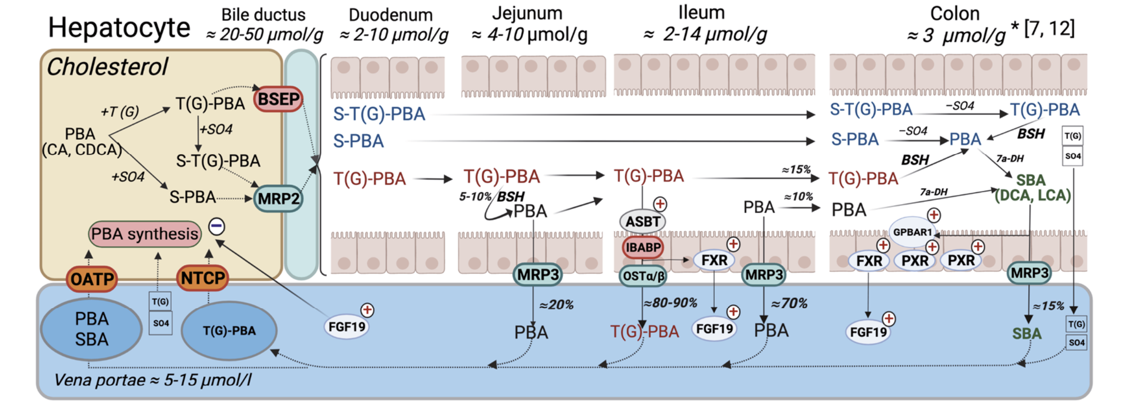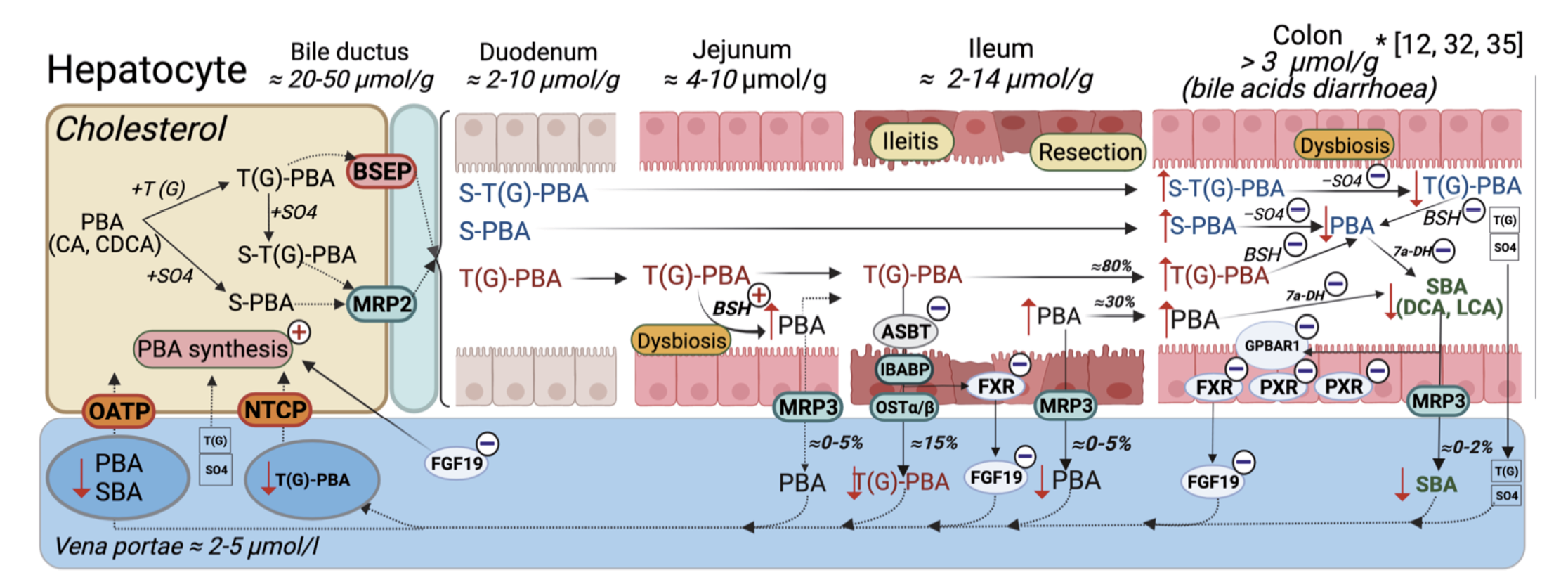 В физиологических условиях 90–95% ЖК подвергается обратному всасыванию. Пассивное всасывание неконъюгированных и небольшой фракции конъюгированных с глицином ЖК происходит по всей длине кишечника, тогда как сульфатированные ЖК не всасываются в тонкой кишке и в неизмененном виде переходят в толстую кишку. Захват конъюгированных ЖК через апикальную мембрану энтероцитов требует присутствия переносчика, а именно апикального натрий-зависимого транспортера ЖК (англ. apical sodium dependent bile acid transporter, ASBT), расположенного в щеточной кайме микроворсинок дистального отдела подвздошной кишки (ПК) с незначительной экспрессией в толстой кишке. Реабсорбированные первичные ЖК от апикальной к базолатеральной мембране энтероцита перемещаются при помощи подвздошного протеина, связывающего ЖК (англ. ileal bile acid-binding protein, IBABP), затем транспортируются в портальную циркуляцию с помощью гетеродимерного транспортера OSTα/β (англ. organic solute transporter alpha-beta), после чего возвращаются в печень. Посредством синусоидального полипептида, транспортирующего таурохолат натрия, (англ. sodium taurocholate cotransporting polypeptide, NTCP) и органического анион-транспортирующего полипептида (англ. organic anion-transporting polypeptid, OATP) реабсорбированные ЖК попадают в гепатоциты и при помощи BSEP/MRP2 повторно секретируются в желчные капилляры (рис. 1) [11].
